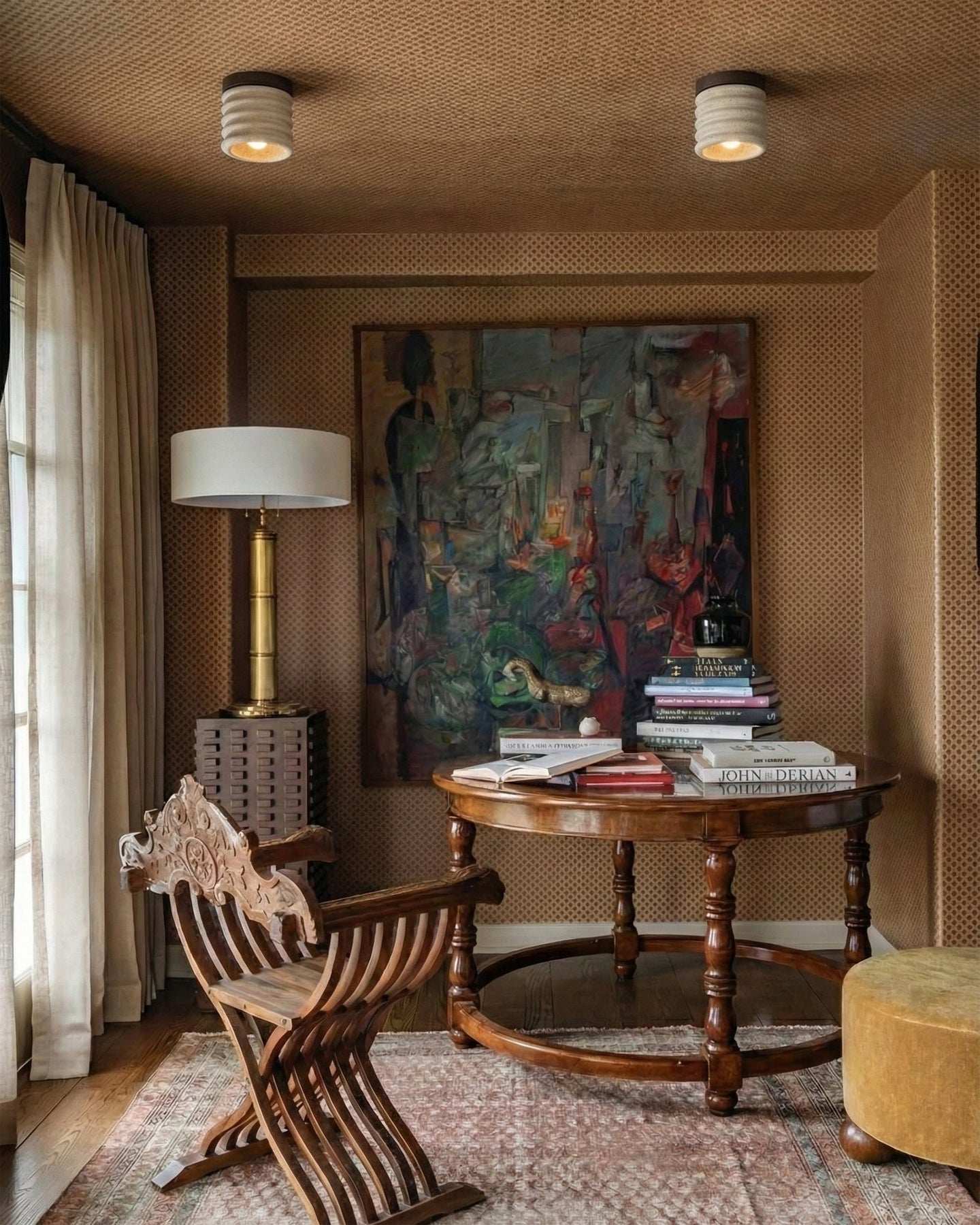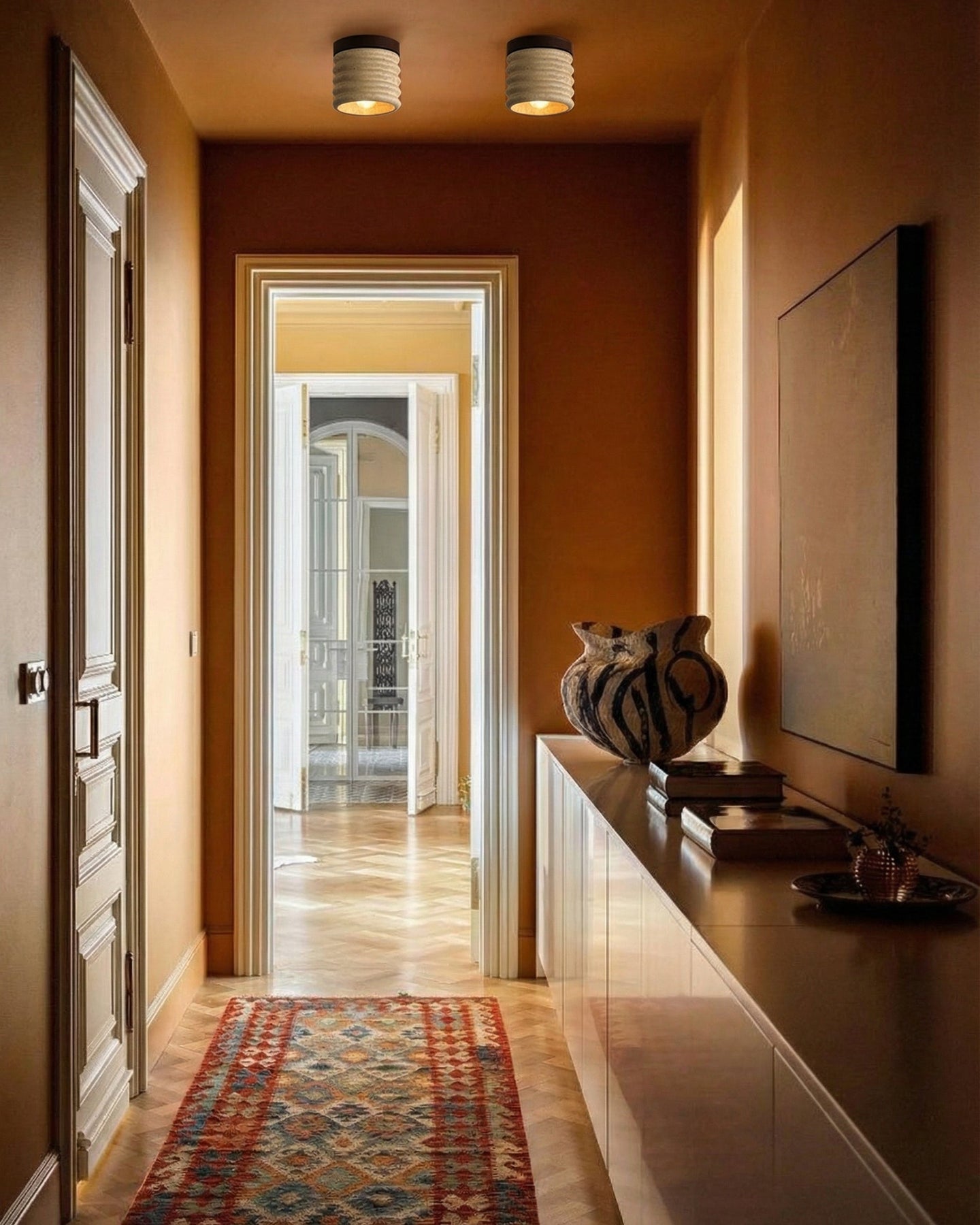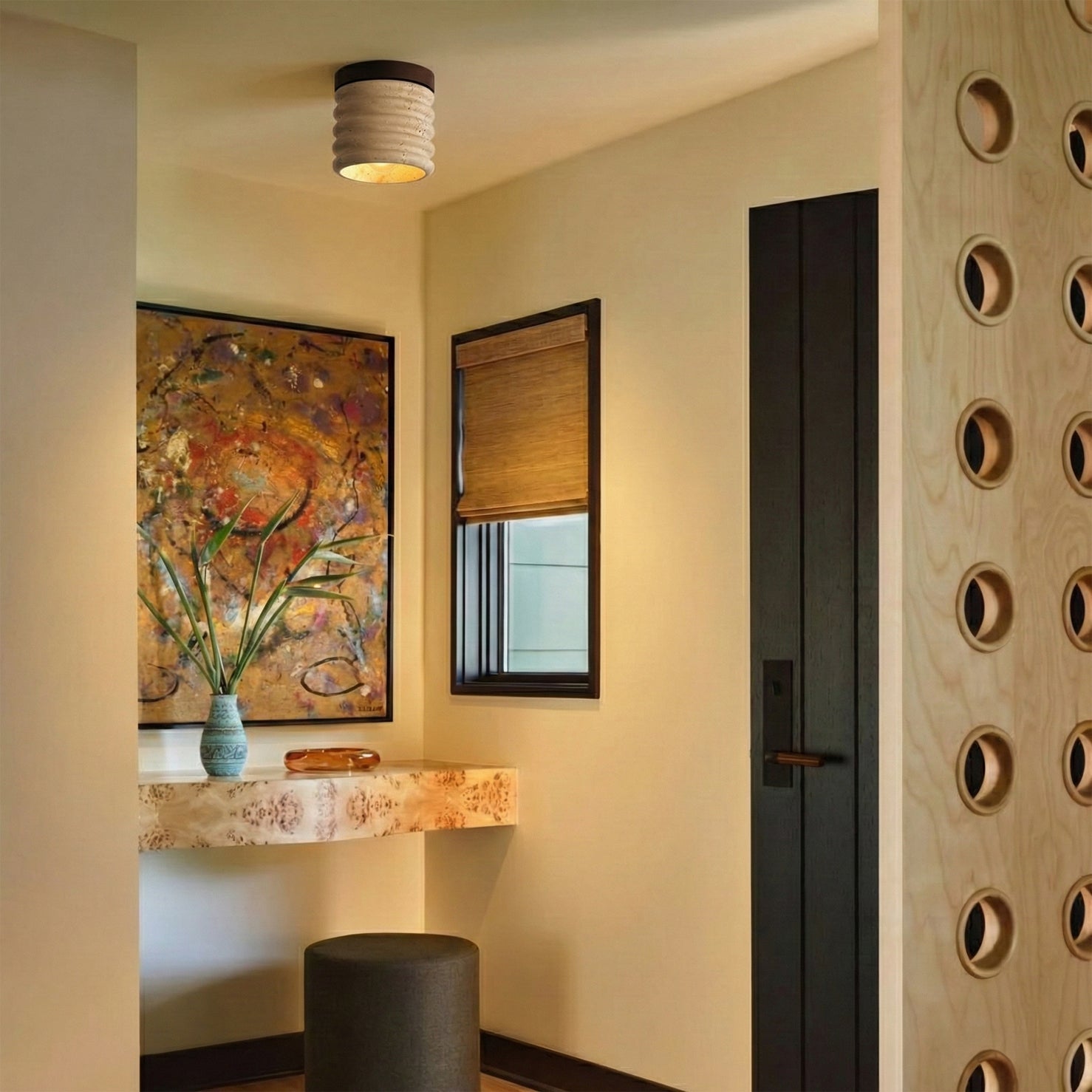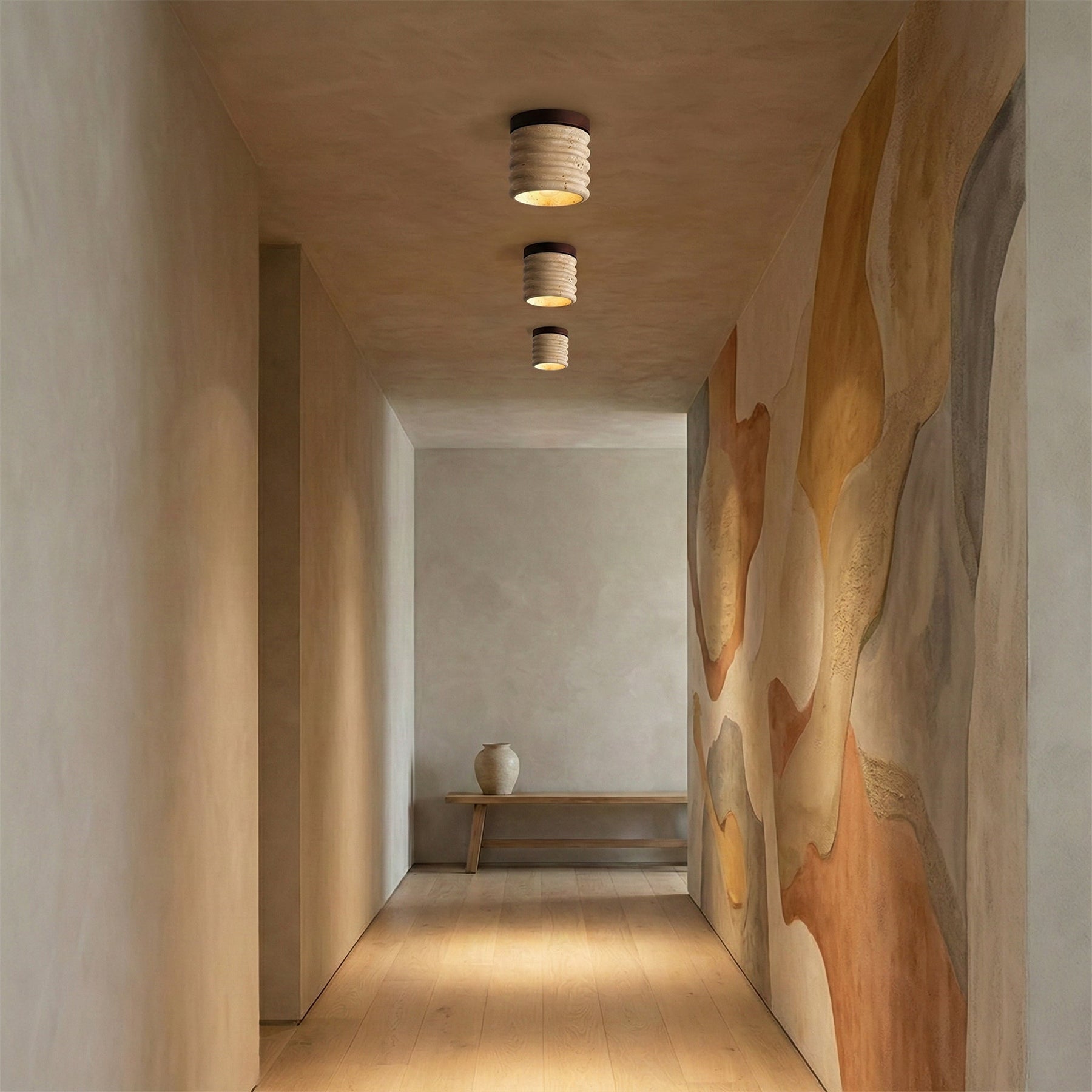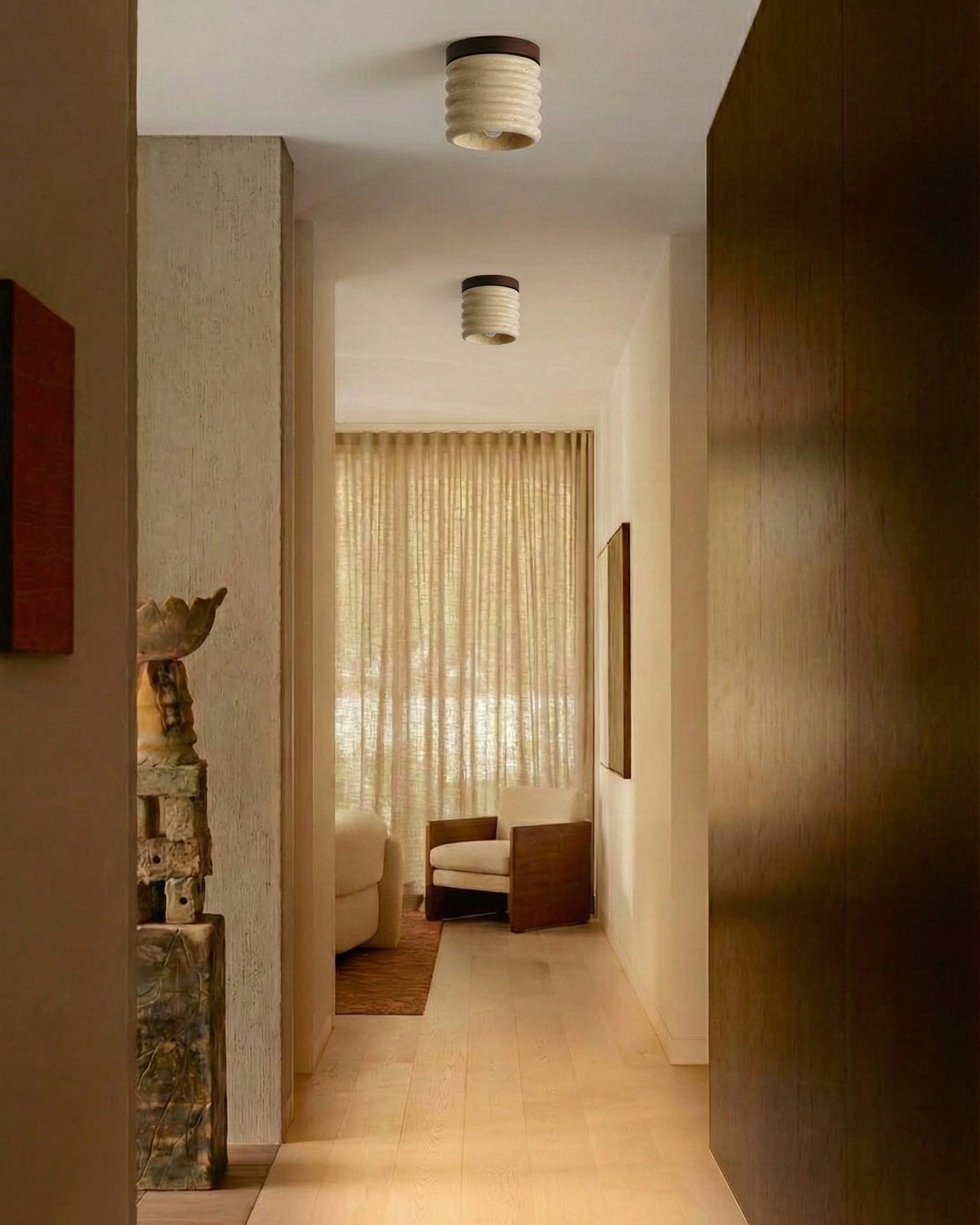 Su suave y difusa luz crea una atmósfera tranquila y acogedora, ideal para dormitorios, pasillos, cocinas o áreas de estar contemporáneas. Compacta pero llamativa, esta lámpara de techo aporta lujo discreto y calidez orgánica a los interiores cotidianos.